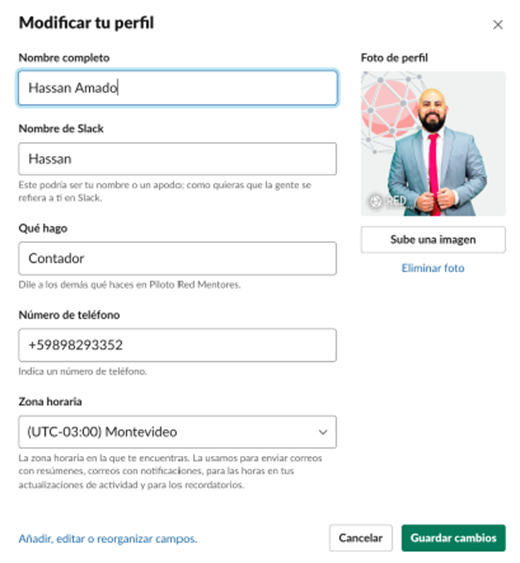 Haz clic en el botón que dice “¡Únete a Slack”. Te iremos guiando paso a paso, pero para que te hagas una idea general, te pediremos que introduzcas tu nombre completo, y que elijas una contraseña, para que puedas conectarte sin problemas. - Configura tu perfil: La información que añadas a tu perfil de Slack permitirá que los demás miembros de tu espacio de trabajo te conozcan mejor.